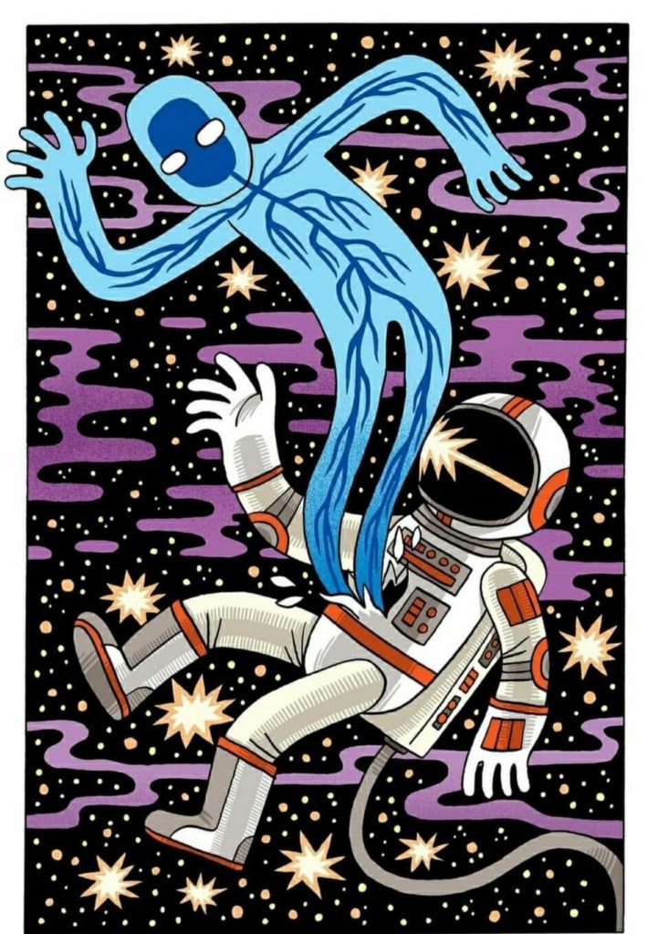 Two Hells Angels walked Searle and Dennett into the fiery pit of the wormhole. As they both turned around to say hello, a window in time swung open. Searle’s hair blew back from the blast of the wormhole. Now the wormhole cast a punctured window into time-space. And in this window a swirl of objects and images tumbled: an ancient astrolabe once owned by Paracelsus, a Paleolithic stone wheel, and Aldous Huxley trapped in a chrome yellow Riemann surface cube.